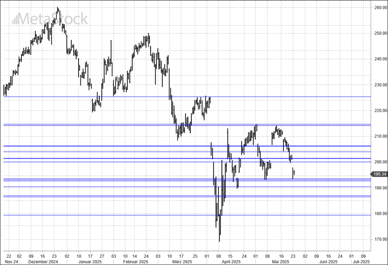 1) It could break the consolidation of the past 6 weeks to the downside and trigger SELL signals with the break of the supports at 192.50, 190 and 186 and extend the downtrend below 179 and below the April low at 169.21. Long-term supports are at 157 and 122.